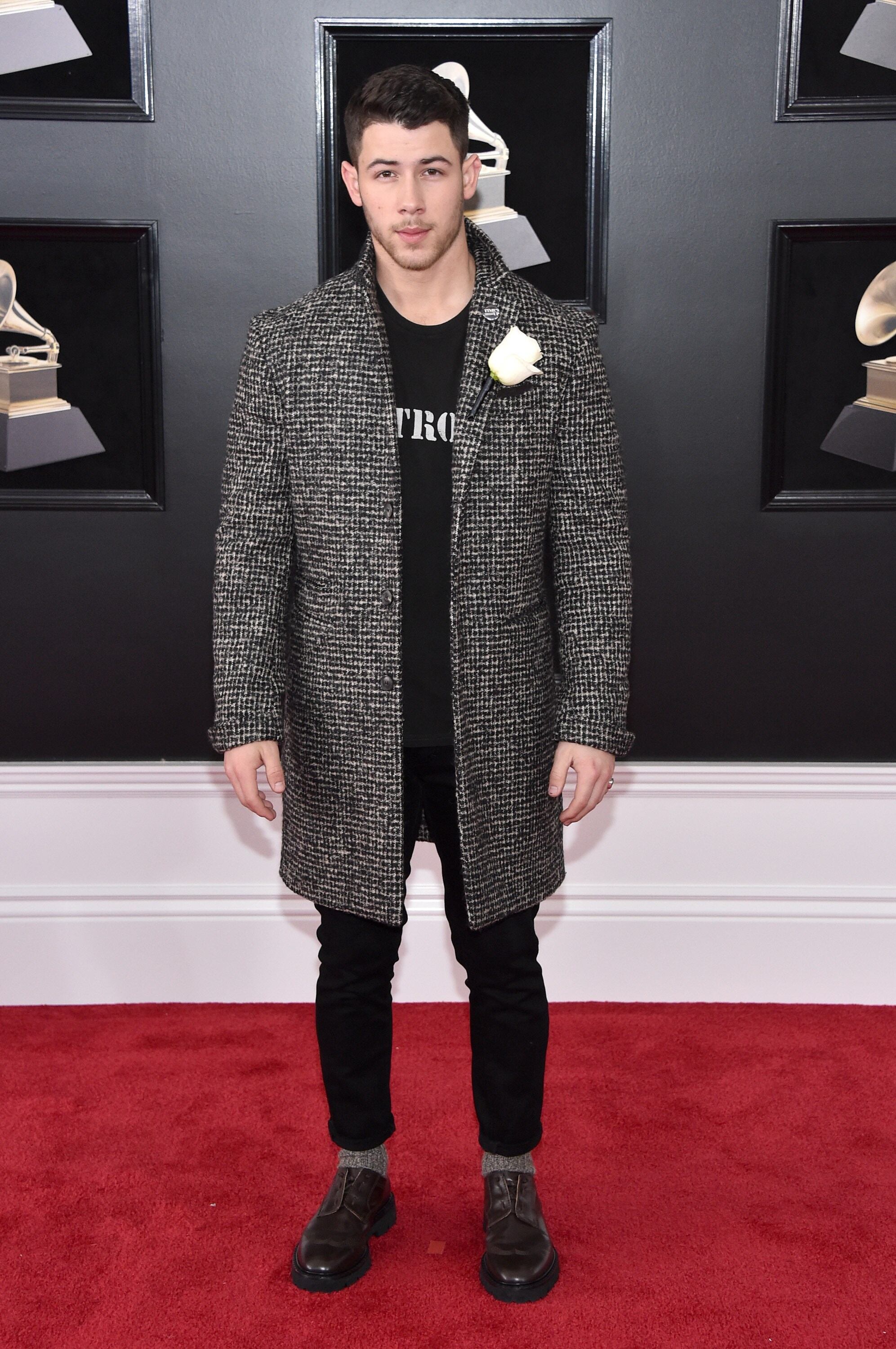 Nick Jonas llegó con cardigan gris y una camiseta.