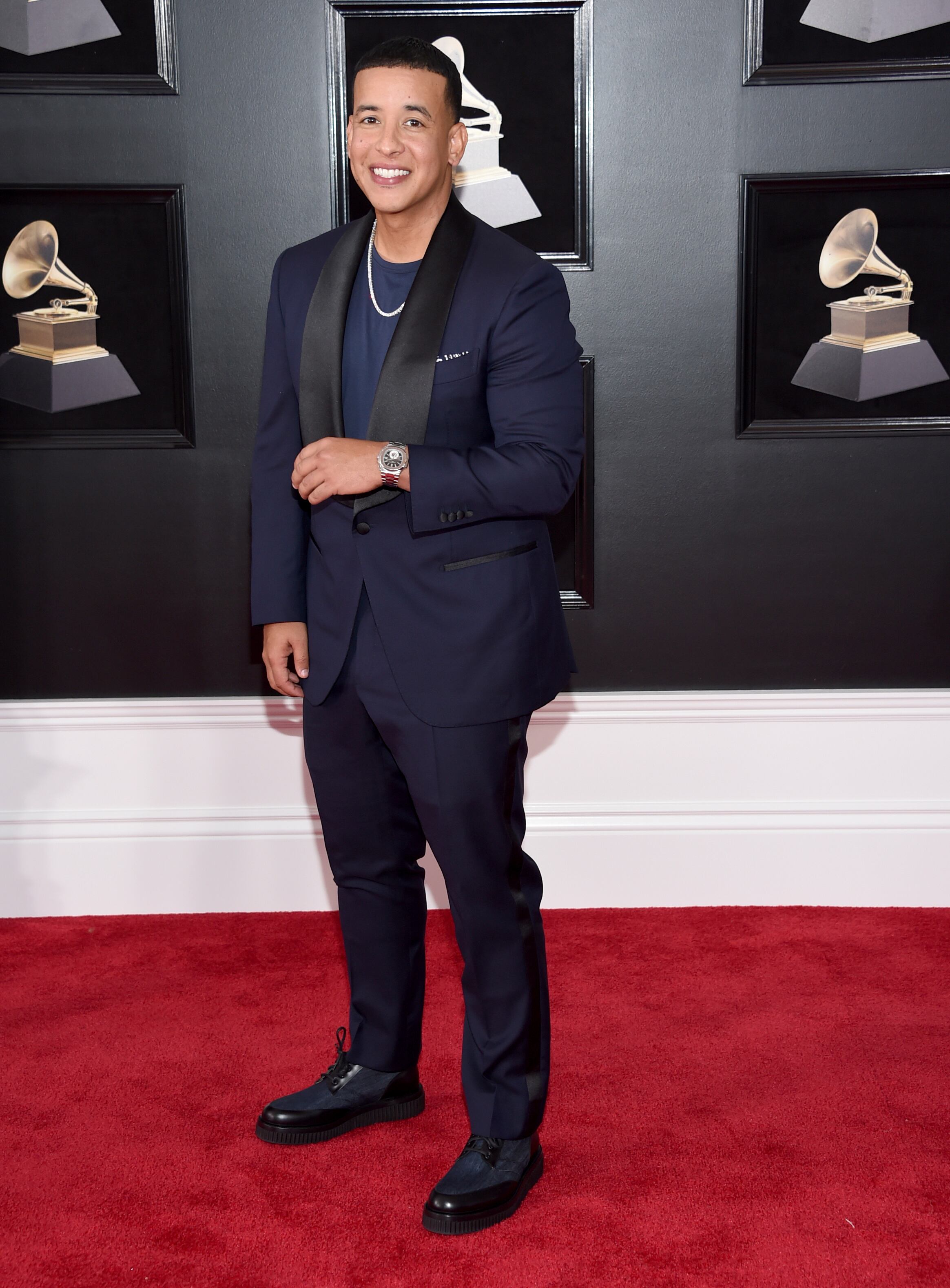 El puertorriqueño Daddy Yankee espera tener una gran noche en los Grammy gracias a su canción Despacito. Su elegante traje azúl lo combinó con una camiseta.
