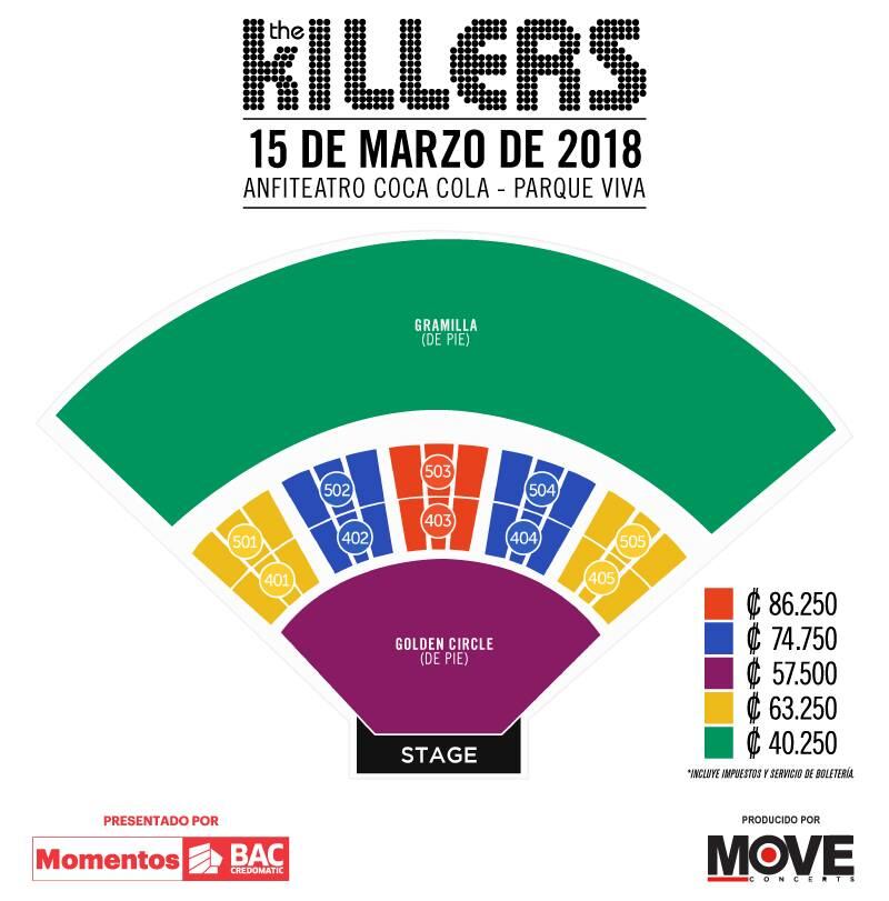 Los precios son ¢40.250 en gramilla (más lejos del escenario), ¢63.250 en sectores 401, 501, 405, 505 (con asiento numerado), ¢57.500 en Golden Circle (de pie frente al escenario), ¢75.750 en sectores 402, 404, 502 y 504 y ¢86.250 en sectores 503 y 403.