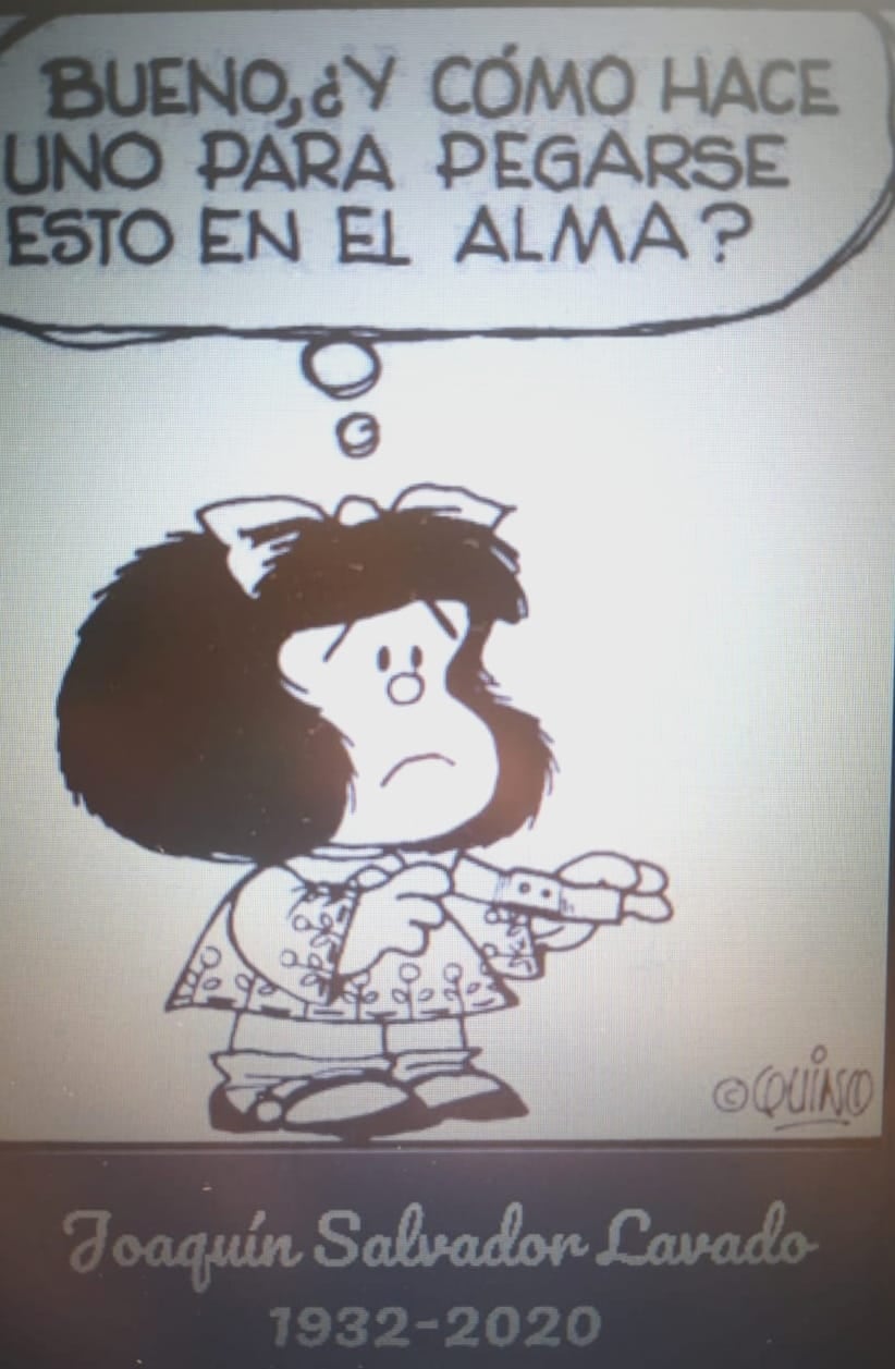 “Bueno, ¿y cómo hace uno para pegarse esto en el alma?”, se pregunta Mafalda con gesto desolado y una curita en la mano. Su papá, Quino, menos conocido como Joaquín Salvador Lavado Tejón, trazó esa imagen alguna vez y este 30 de setiembre del 2020, su genialidad mezclada con la descarnada malicia infantil de sus personajes, le planta a sus millones de fans en el mundo una suerte de epitafio que cobija el sentir generalizado ante su partida.