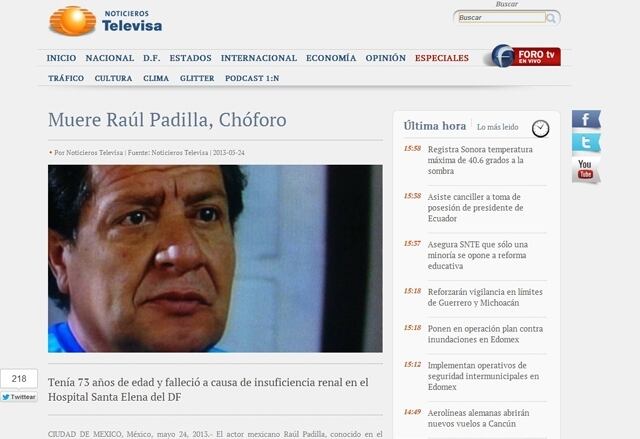Duelo. El comediante mexicano Raúl Chóforo Padilla falleció el viernes, a los 73 años de edad, por complicaciones derivadas de la insuficiencia renal que sufría, según informó la revista People en su sitio de Internet .