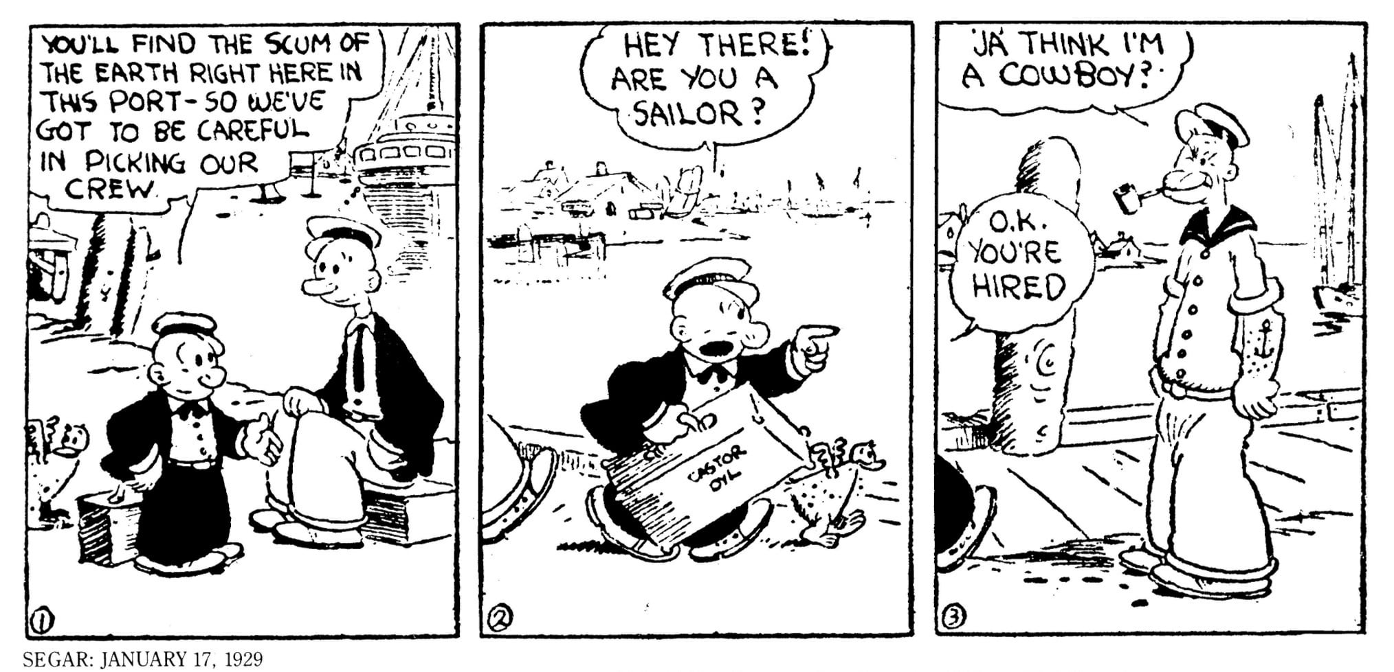 Ja’ think I’m a cowboy? (¿A’caso parezco vaquero?) fue la frase con la que debutó Popeye en aquel cómic, donde frotaba una gallina en procura de fuerza antes de comenzar a consumir espinacas.
