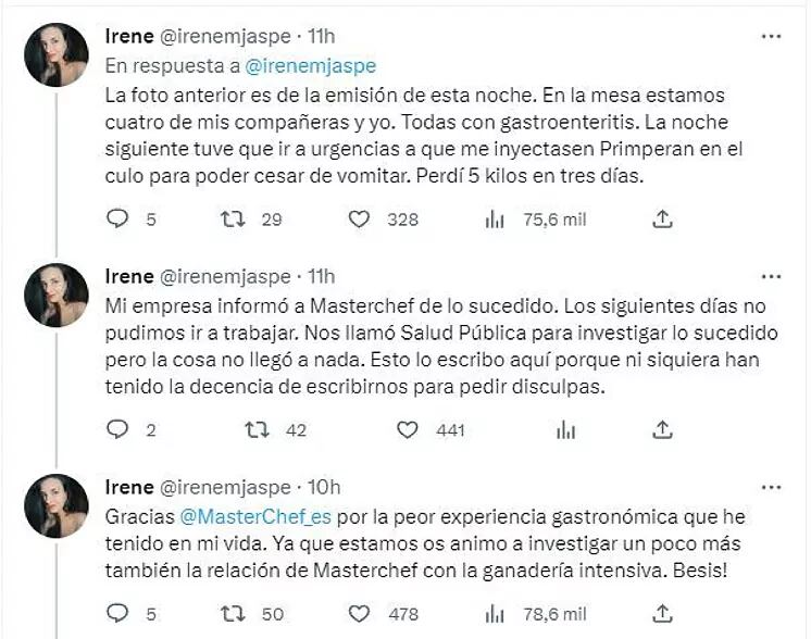 “De 70 personas, más de la mitad acabamos intoxicadas. (...). La noche siguiente tuve que ir a urgencias a que me inyectasen Primperan en el trasero para poder cesar de vomitar. Perdí 5 kilos en tres días”, denunció Irene, como se identifica la usuaria en Twitter.