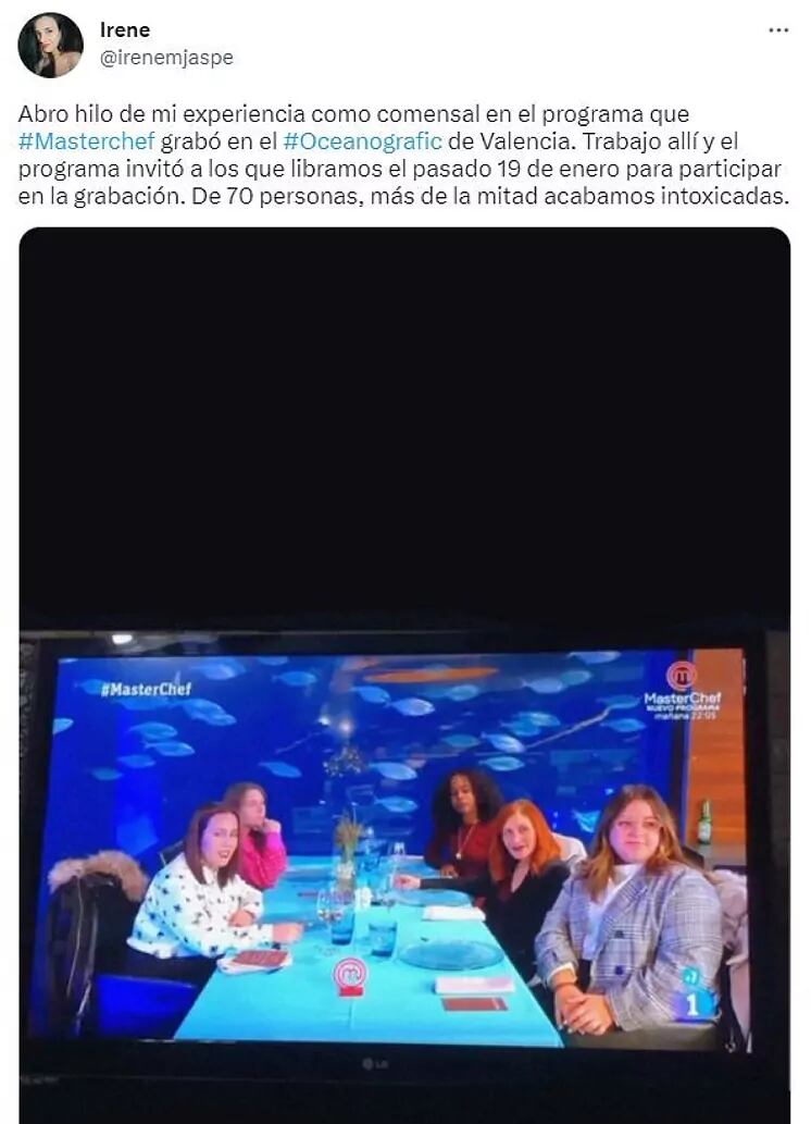 Una comensal del famoso programa español MasterChef denunció, en su cuenta de Twitter, que sufrió, junto a sus compañeros de trabajo, una intoxicación por degustar los platillos cocinados para el cuarto capítulo de la temporada número 11. Los hechos —según la mujer— sucedieron en enero, cuando se grabó la entrega; no obstante, dio a conocer su experiencia hasta este fin de semana, cuando se transmitió.