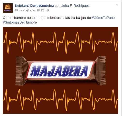 Un post del ciudadano Paulo Feoli, quien reclamó públicamente a la compañía, lo dice todo: "Nada bien por parte de Snickers burlarse de un adulto mayo en este chistecito que pusieron hoy en su página (fue el 20 de abril). El community manager es un irrespetuoso y seguro no tiene abuelita. Ella habló así en la confianza de una llamada privada, es cierto que se pasó de la raya y se puso malcriada, pero la llamada era confidencial. Si un ciudadano común usa esta situación como chiste 'entre amigos', pues ni modo, es parte del choteo del tico, pero que la burla venga de Snickers? (Mars Incorporated) Nada bien. Pésima imagen corporativa y manejo de responsabilidad social".