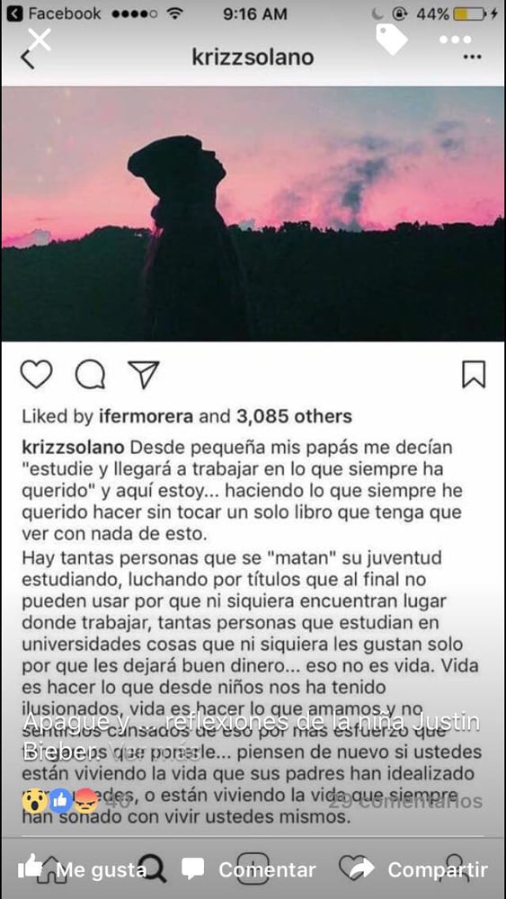 Esta muchacha vive sometida a una pretenda presión social por tener años de haberse convertido en la enemiga pública más gratuita que uno recuerde en la historia del país. Pero no puede ponerse “pa' que le den” posteando unas líneas que no la reflejan como la persona educada, más bien callada, que nosotros conocemos.
