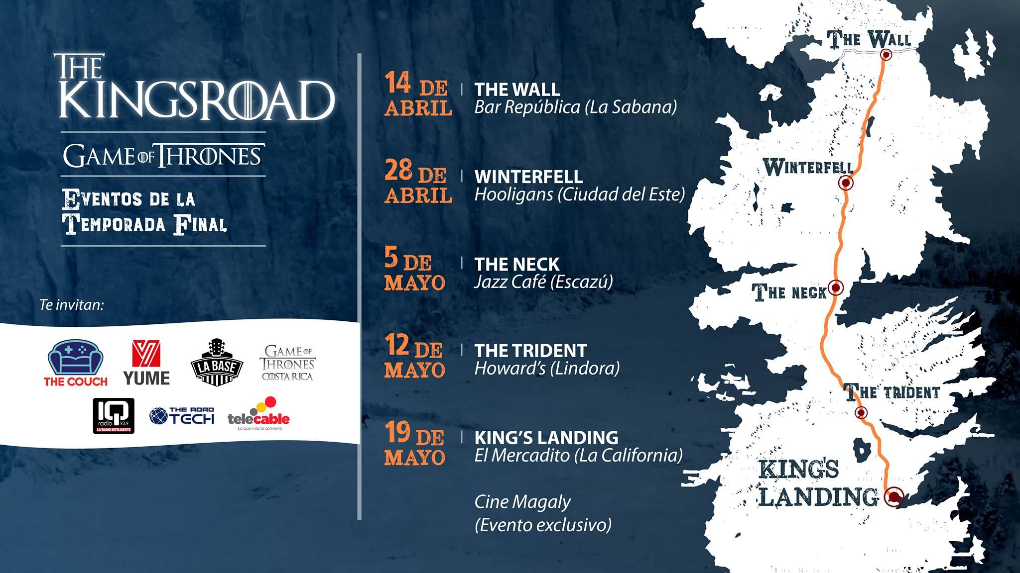 Basta con entrar a Facebook para ver la abrumadora cantidad de actividades organizadas para juntar a los fanáticos que quieren ver en compañía de sus pares los seis capítulos de la última temporada. El grupo de aficionados de Game of Thrones Costa Rica unió esfuerzos con medios de comunicación especializados en cultura geek como The Couch, Revista Yume y La BaseCR para programar una ambiciosa seguidilla de eventos para despedir al trono de hierro como se merece.