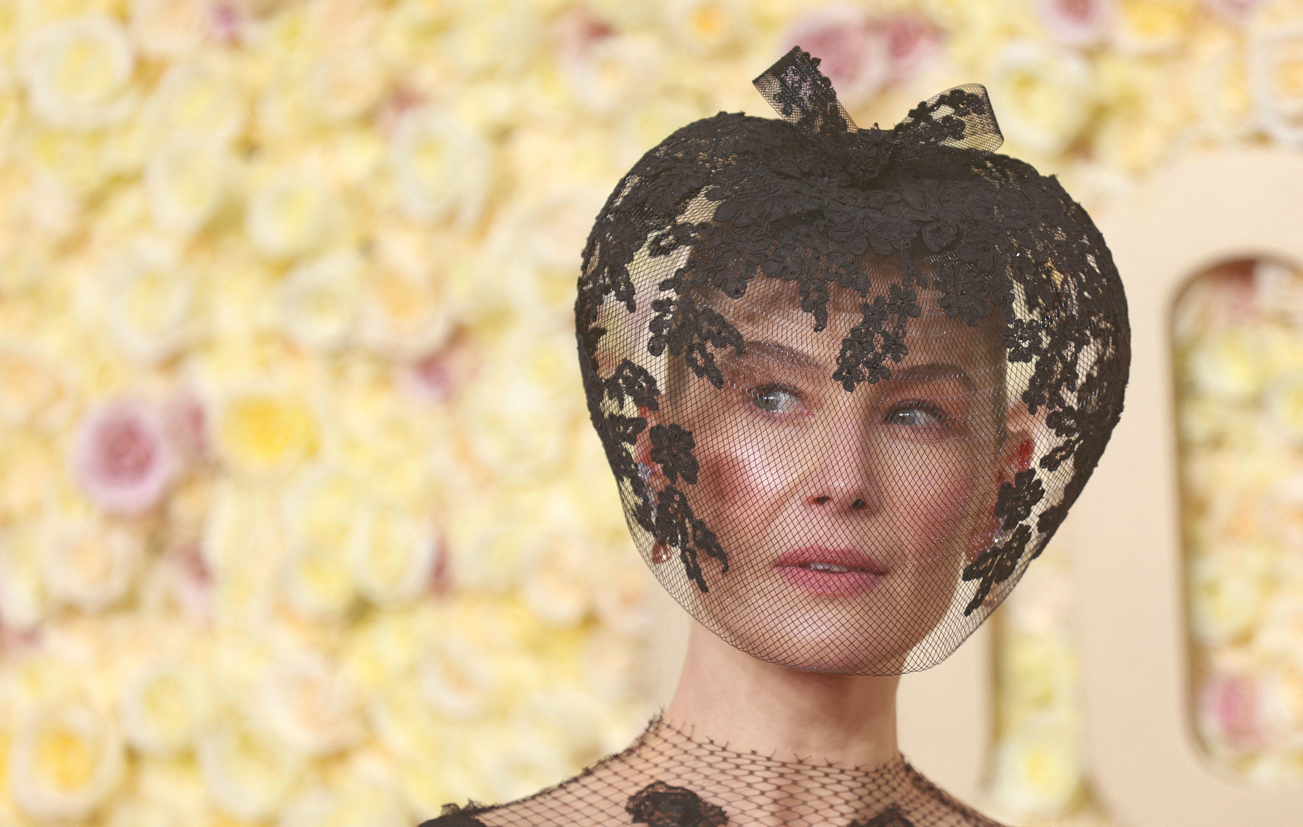 Una de las primeras en desfilar fue la actriz inglesa Rosamund Pike, quien llamó la atención por utilizar un velo negro de encaje que cubría parte de su rostro.
