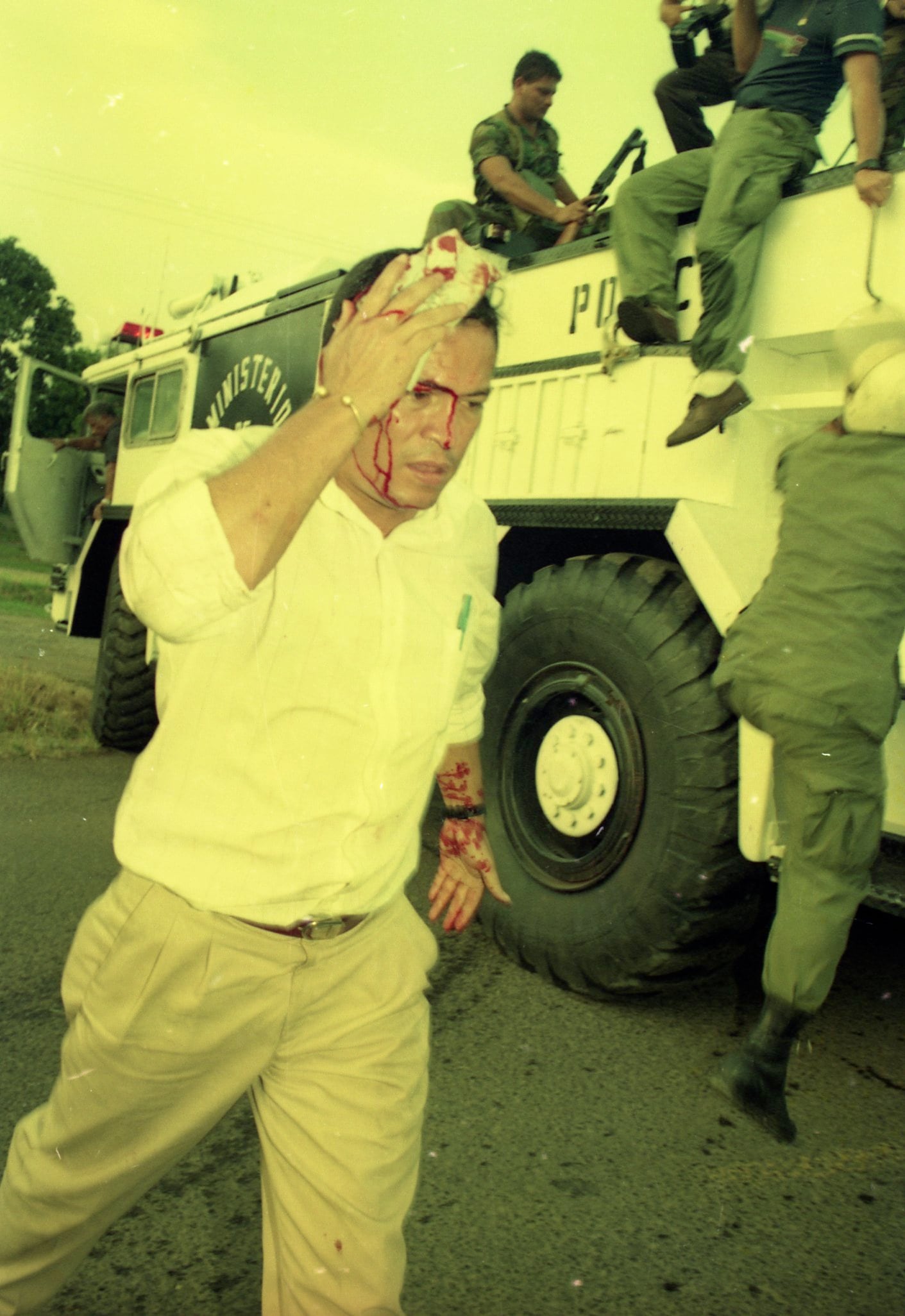 “En Esparza, recuerdo que me subí a un vehículo policial para tener capacidad de imagen y narrar en vivo lo que transmitíamos a la móvil. El camión fue donado por los bomberos de Chile y estaba equipado para lanzar agua y separar a los manifestantes. De pronto el camión arrancó y quedamos en el fuego cruzado, recibí una de las piedras”, recordó.