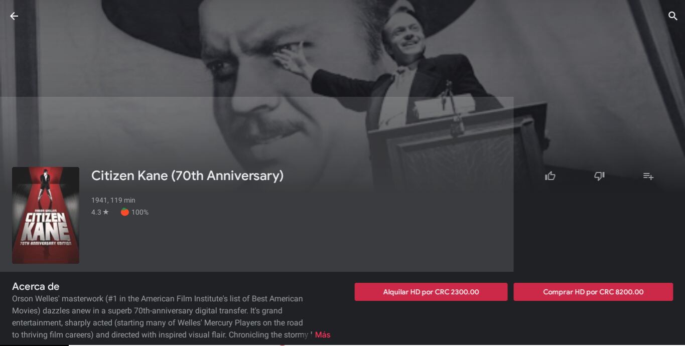 Esto es aún más ventajoso para quienes buscan películas clásicas que no están disponibles en servicios de streaming de mensualidad fija. Netflix, por ejemplo, es especialmente flojo en su catálogo de títulos consagrados, mientras que en Google Play Películas usted puede, por ejemplo, alquilar o comprar El silencio de los inocentes por ¢2300 y ¢5600, respectivamente, y lo mismo con Psicosis (¢2.100 alquiler, ¢3.000 compra); Los imperdonables (¢2.300 y ¢8.100); Los puentes de Madison (¢2.300 y ¢8.100), y La naranja mecánica (¢2.300 y ¢8.200).