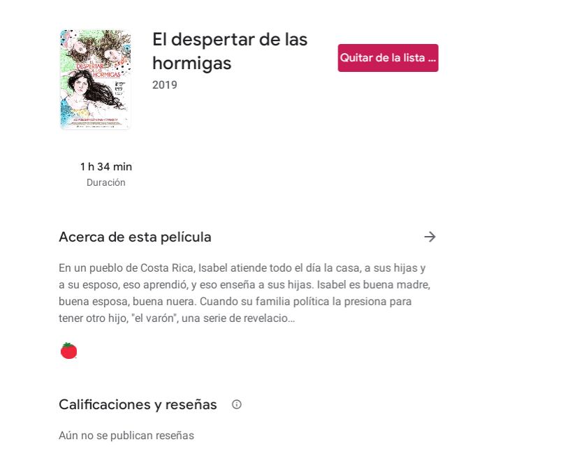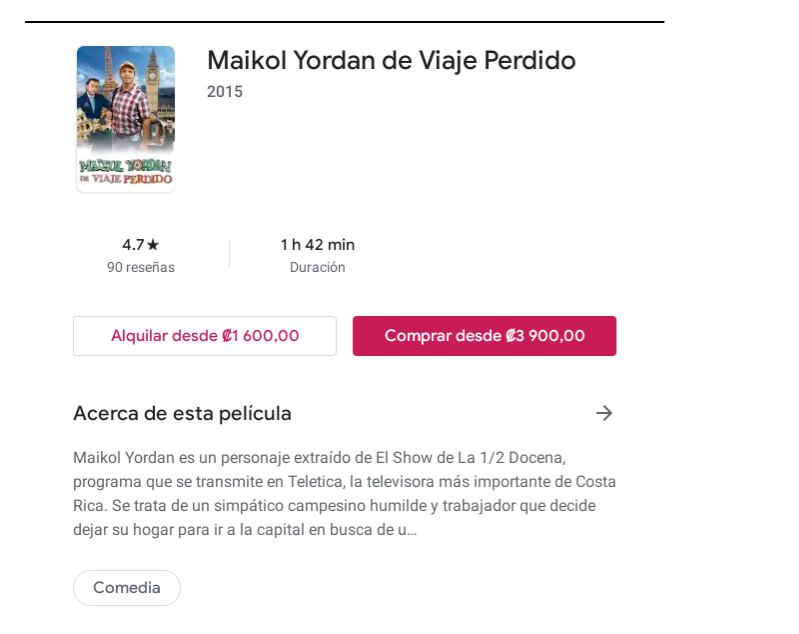 Hay cine tico: Punto a favor de la plataforma de Google es que tiene disponibles algunos filmes costarricenses, que como bien sabemos son difíciles de conseguir en la mayoría de servicios de streaming. Así, por ejemplo, entre los títulos locales ahí ofrecidos están Maykol Yordan de viaje perdido, de Miguel Gómez; Apego, de Patricia Velásquez; y Presos, de Esteban Ramírez. Además, al parecer pronto podrían incorporarse ahí las aplaudidas cintas nacionales El despertar de las hormigas, de Antonella Sudasassi; Violeta al fin, de Hilda Hidalgo, y El baile de la gacela, de Iván Porras, que ya pueden añadirse a la lista de deseos, más aún no verse.
