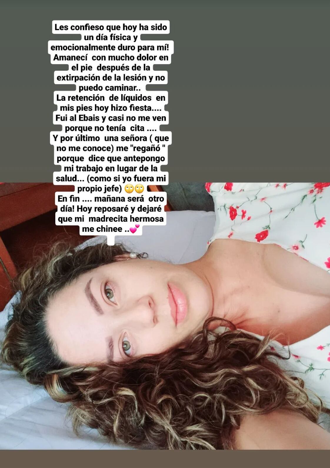 “Les confieso que hoy ha sido un día física y emocionalmente duro para mí. Amanecí con mucho dolor en el pie después de la extirpación de la lesión y no puedo caminar”, escribió la comunicadora en sus historias de Instagram, el viernes.