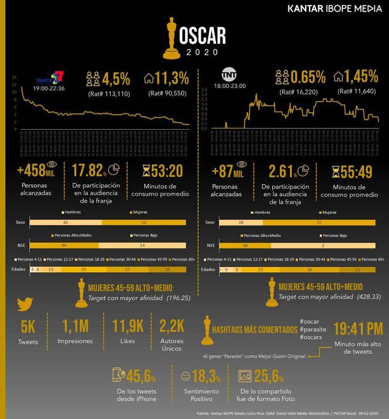 La empresa de mercadeo de investigación de medios de comunicación de América Latina, Kantar Ibope Media compartió información en la que se revela el rating que tuvo en Costa Rica el programa que premia lo mejor del cine y que fue visto en Teletica y TNT. En los datos, la empresa antes conocida solamente como Ibope también detalla en qué momento los costarricenses escribieron en Twitter mensajes relacionados con la premiación.