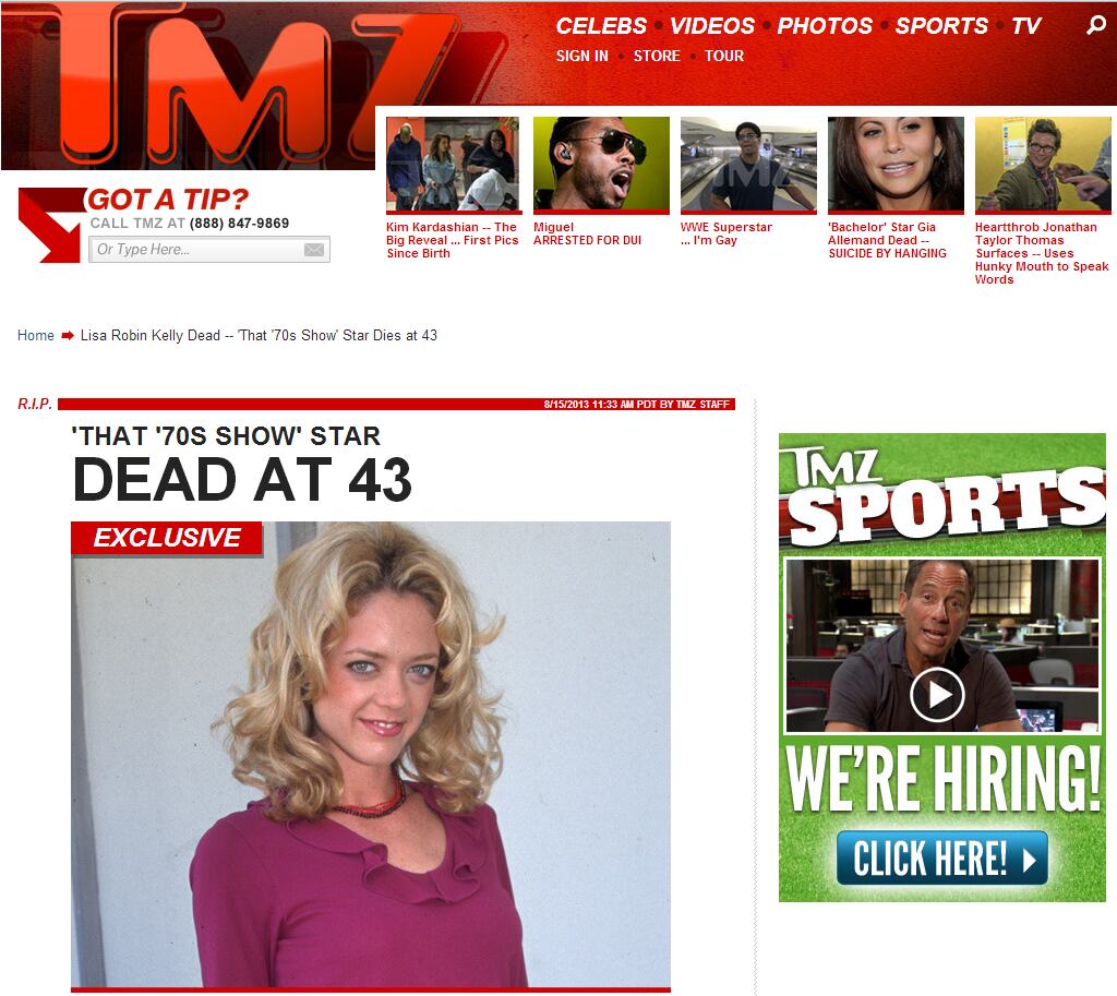 La estadounidense Lisa Robin Kelly murió la noche del miércoles, a sus 43 años, en una clínica de rehabilitación, en California, según informó TMZ. La actriz era conocida por el papel de Laurie, la hermana de Eric Forman en la comedia That '70s Show.