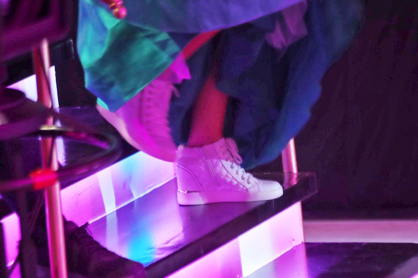 Para empezar, comentó que los tenis blancos que llevaba el domingo 21 son los que muchas novias eligen para usar el día de la boda y sentirse cómodas; ella confió que ella los usa con los vestidos de gala desde hace dos temporadas del concurso de ballroom.