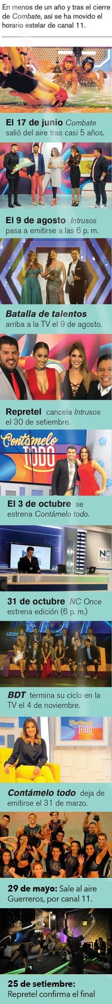 El 9 de agosto, el programa Intrusos dejó su horario de las 10 p. m. y se trasladó a las 6 p. m., siempre por canal 11. Ese mismo día, Repretel puso al aire una gran apuesta: Batalla de talentos, que se transmitió por tres meses.