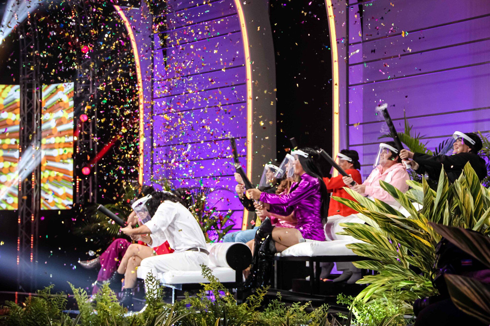 Al finalizar el programa, los participantes celebraron lanzando serpentinas de colores. Luego todos tomaron el escenario, eso sí, manteniendo la distancia y usando caretas protectoras.