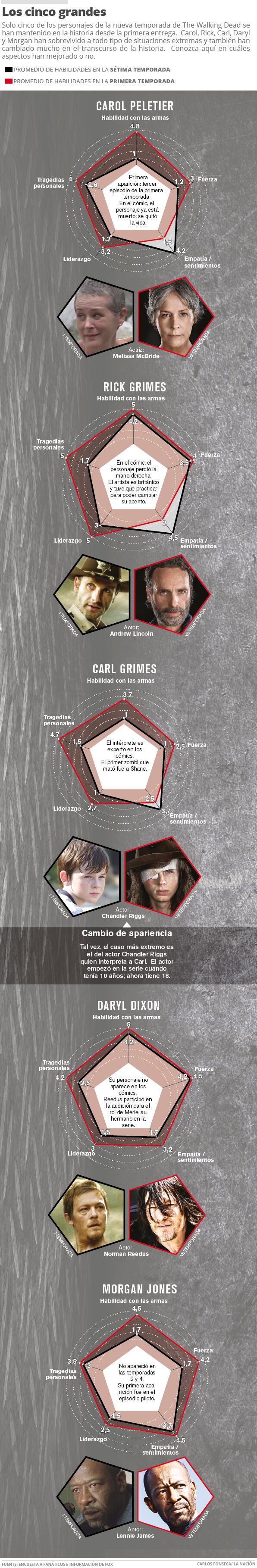 Cinco de los miembros de la serie se han mantenido desde su primera entrega y son, sin lugar a dudas, pilares fundamentales en el desarrollo de la historia. Rick (Andrew Lincoln), Daryl (Norman Reedus), Carl (Chandler Riggs), Carol (Melissa McBride) y Morgan (Lennie James) tendrán en sus manos, junto a otros importantes líderes como Maggie, interpretada por Lauren Cohan, su destino y también el de los habitantes de sus comunidades.