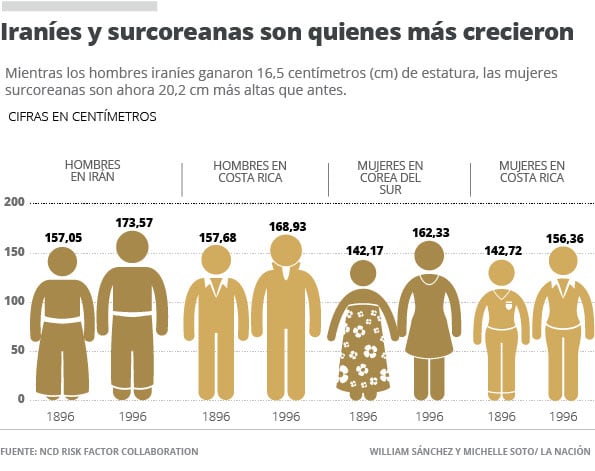 Sin embargo, los ticos no alcanzaron los primeros lugares en mayor estatura en el mundo. Los varones iraníes y las mujeres surcoreanas fueron quienes más centímetros sumaron a su talla en el último siglo.